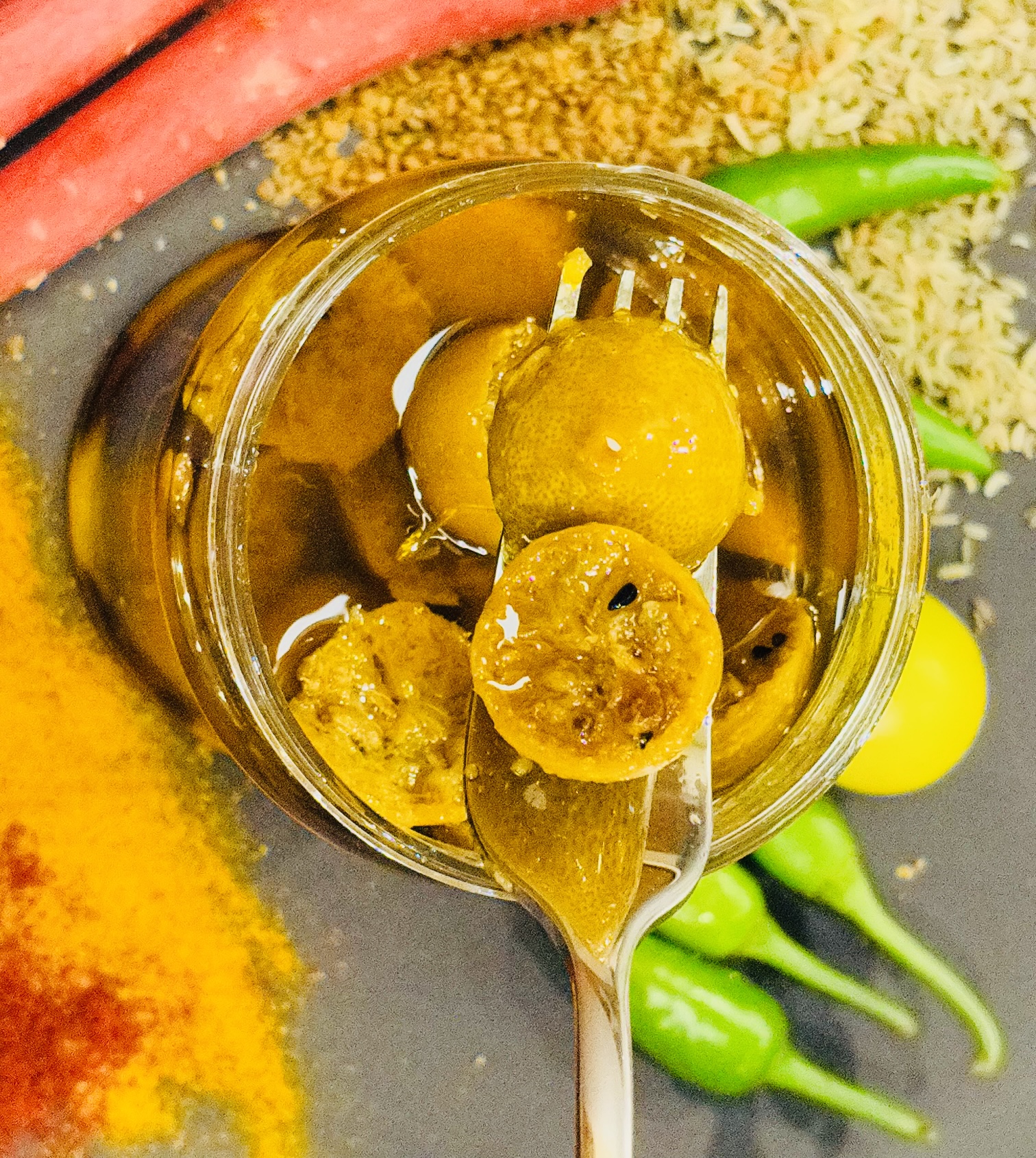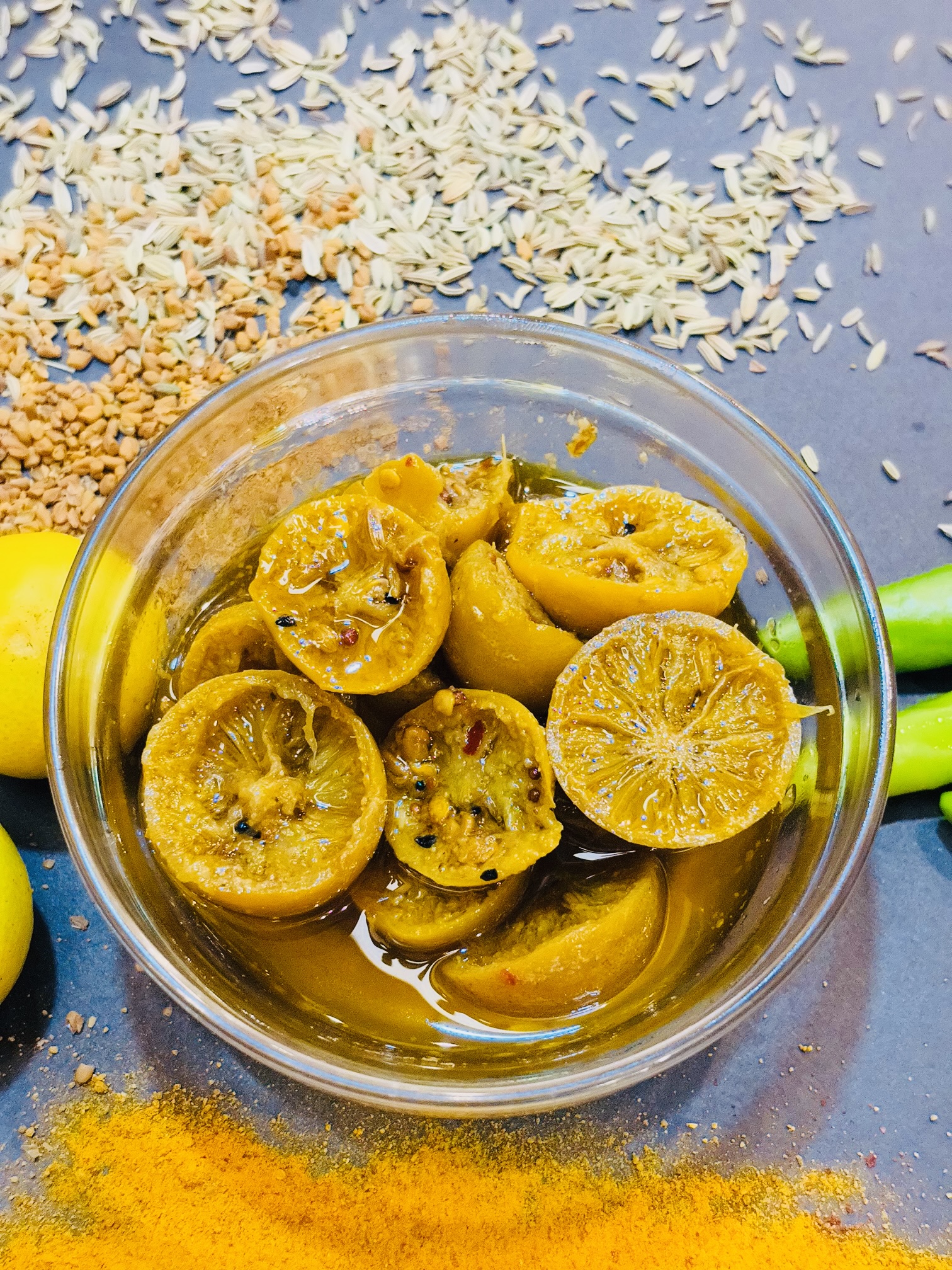 تازہ لیموں کو آدھا ٹکڑوں میں کاٹ کر ایک رات کے لیے نمک اور ہلدی پاؤڈر کے ساتھ مرینیٹ کیا جاتا ہے۔ اگلے دن، ان کا پانی اتار کر خشک کیا جاتا ہے اور بہترین معیار کے سرسوں کے تیل میں محفوظ کیا جاتا ہے، جس میں دیگرمصالحوں اور جڑی بوٹیوں جیسے سونف ، میتھرے، کلونجی، رائی اور چلی پاؤڈر بھی شامل کیے جاتے ہیں۔