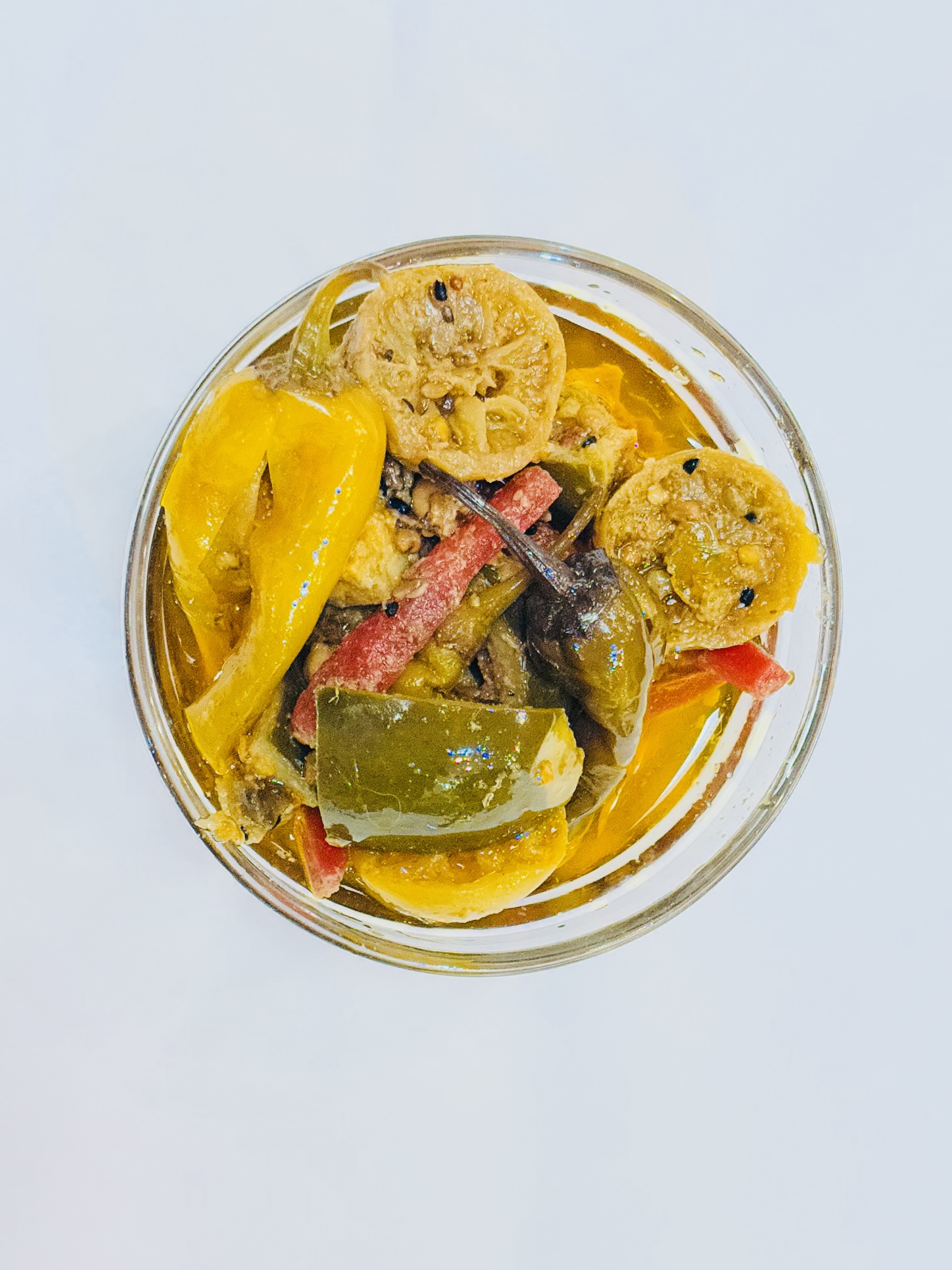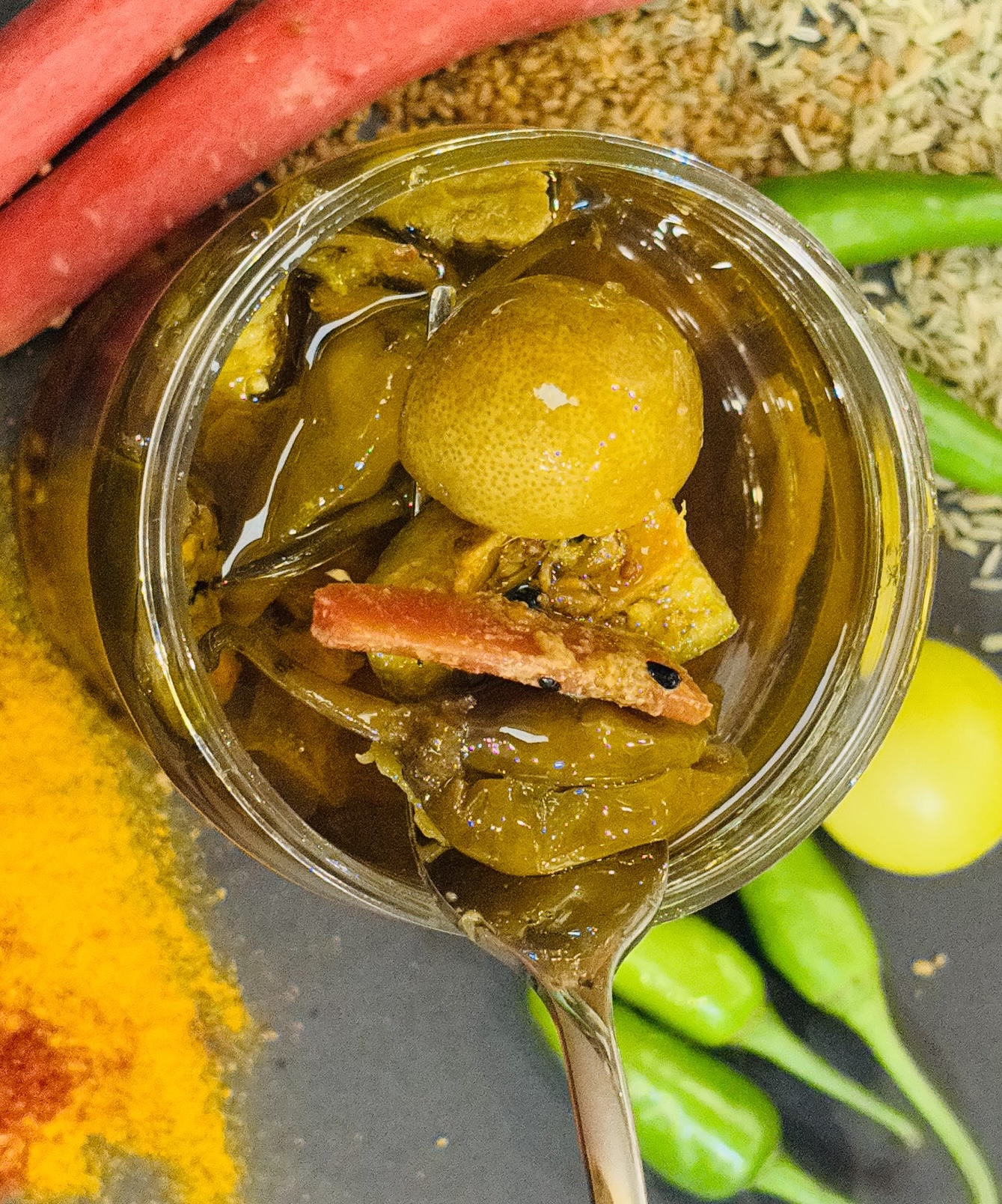 سبزیوں کے ٹکڑوں کو سات ضروری جڑی بوٹیوں اور مصالحوں کے ساتھ مہارت سے ملا کر خالص سرسوں کے تیل میں، صدیوں سے چلنے والی روایات کے مطابق، محفوظ کیا جاتا ہے۔